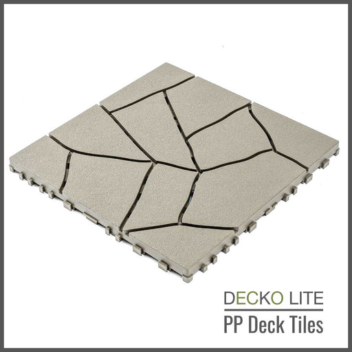 DECKO PP Lite Tiles offer a more budget friendly alternative to the Premium Composite Wood Deck Tiles with the same key advantages! They are very durable and Maintenance Free, Easy to Install and Waterproof, made of 100% recycled polypropylene offering a stunning stone aesthetic over the traditional 4 plank 'deck' like tiles