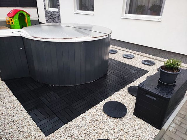 Charcoal tiles around a spa