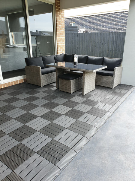 Matching charcoal deck tiles and furniture